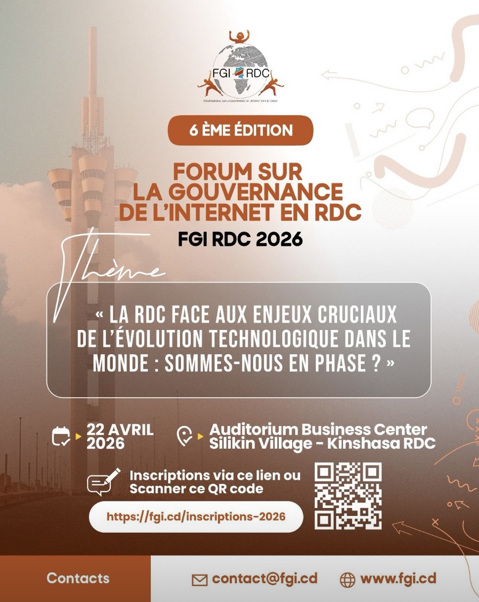 Nous avons le plaisir d’annoncer la tenue de la 6ème édition du Forum sur la Gouvernance de l’Internet en République Démocratique du Congo (FGI RDC), qui se déroulera le 22 avril 2026 à l’Auditorium Business Center, Silikin Village, Kinshasa.