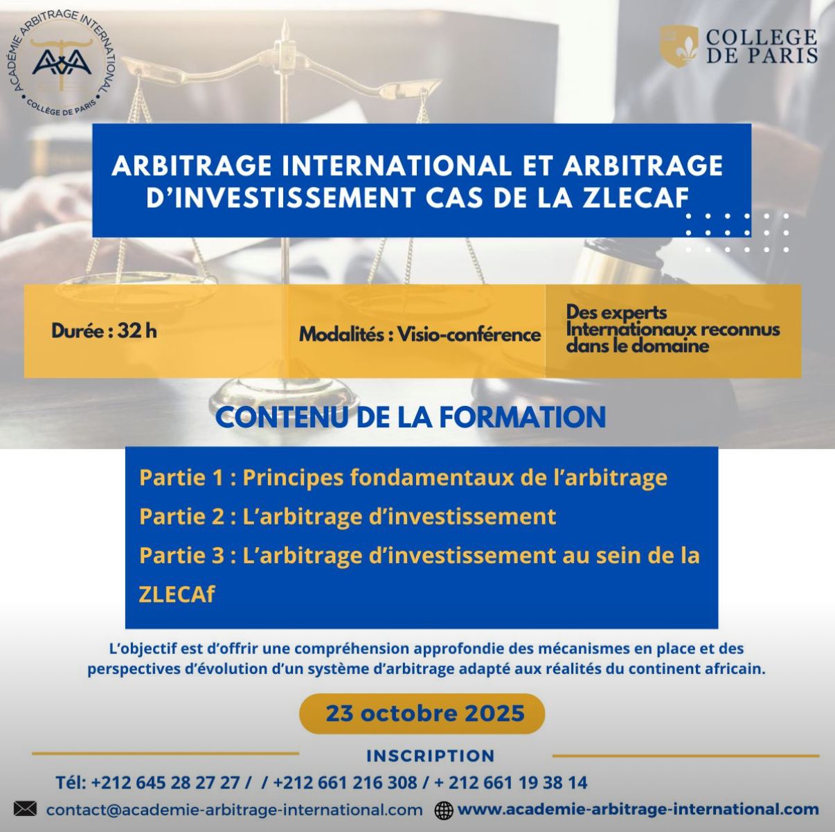 L’Académie Arbitrage International, en partenariat avec le Collège de Paris, lance une formation exclusive consacrée à l’arbitrage international et à l’arbitrage d’investissement, avec un focus particulier sur le cadre juridique et économique de la Zone de Libre-Échange Continentale Africaine (ZLECAF). Cette formation de 32 heures, organisée en visioconférence, est destinée aux juristes, avocats, experts en investissement, étudiants en droit, ainsi qu’à tous les acteurs économiques impliqués dans les relations commerciales et d’investissement en Afrique.
