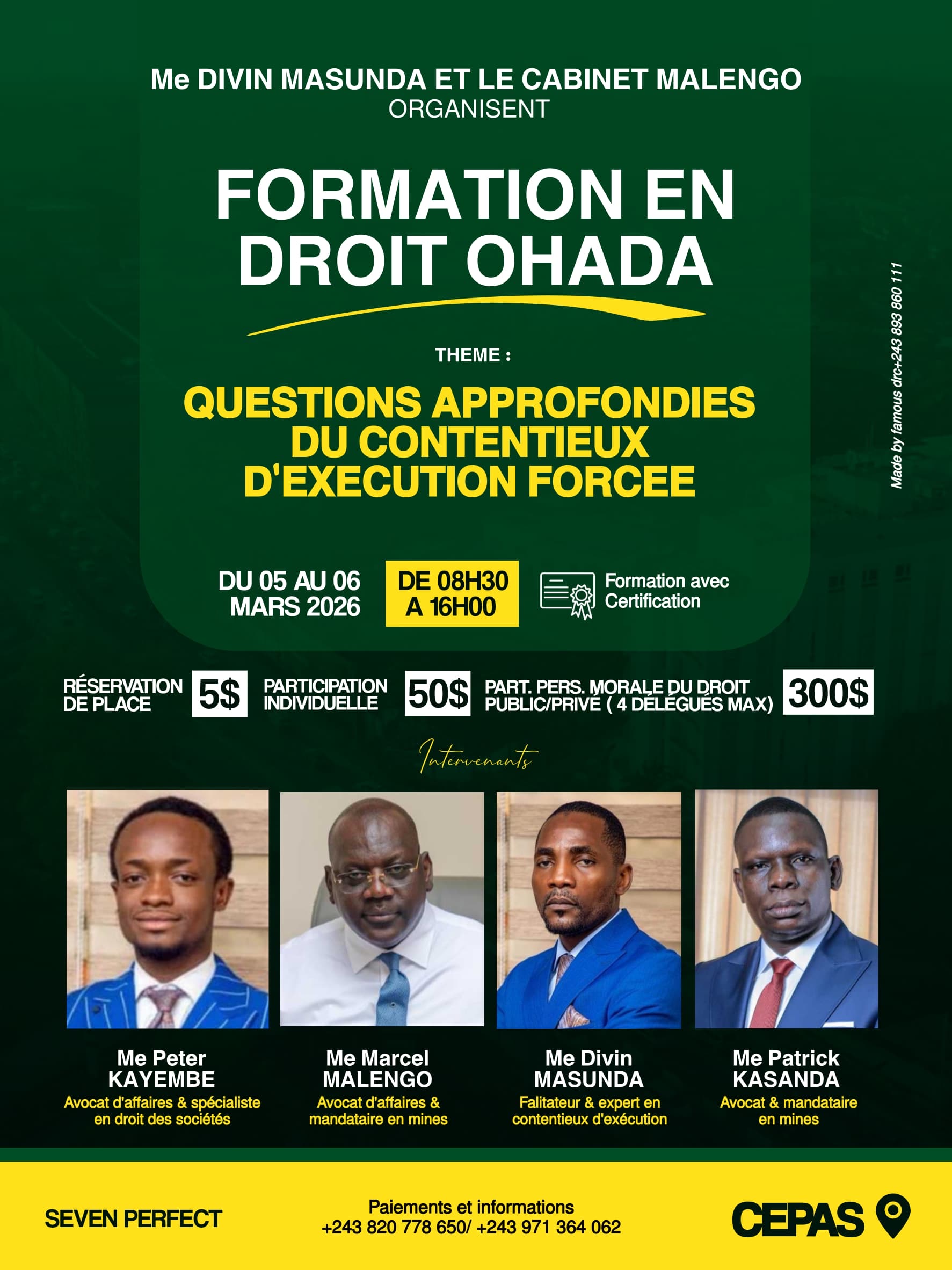 Me Divin Masunda et le Cabinet Malengo ont le plaisir de vous inviter à une formation exclusive sur les Questions Approfondies du Contentieux d’Exécution Forcée ! ??