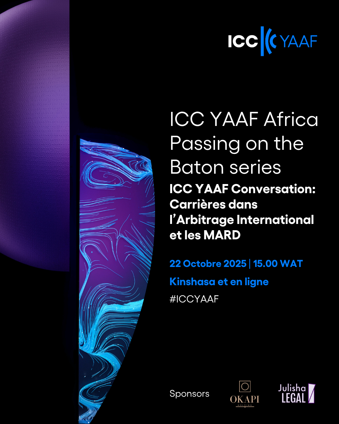 Retrouvez-nous à Kinshasa & en Ligne ce 22 Octobre 2025.Ne manquez pas le lancement de la série d'événements "Passing on the Baton" (Passer le relais) avec la première Conversation ICC YAAF (Forum des jeunes arbitres et experts en MARD de la Chambre de Commerce Internationale). Cet événement incontournable se tiendra le mercredi 22 octobre 2025, offrant une opportunité unique de réseautage et de mentorat.