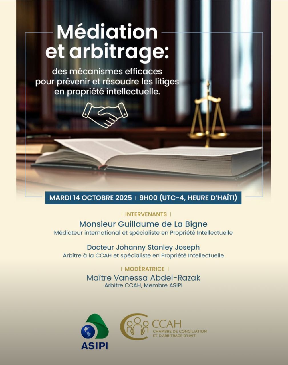 Le mardi 14 octobre 2025 à 9h00 (UTC-4, heure d’Haïti), une conférence dédiée à ce sujet capital sera organisée, réunissant des experts reconnus dans le domaine de la médiation, de l’arbitrage et de la propriété intellectuelle. Cet événement est une occasion unique pour les professionnels du droit, les entreprises, les créateurs et tous les acteurs concernés par la propriété intellectuelle d’approfondir leurs connaissances sur ces modes alternatifs de résolution des conflits.