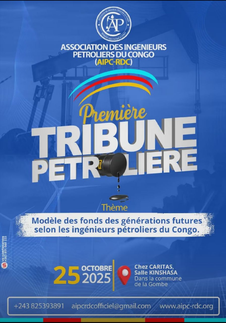 L’Association des Ingénieurs Pétroliers du Congo (AIPC-RDC) a le plaisir d’annoncer la tenue de sa toute première édition de la Tribune Pétrolière, un événement majeur qui se tiendra le 25 octobre 2025 à la salle Kinshasa, située au sein de l’institution Caritas, dans la commune de la Gombe à Kinshasa.
