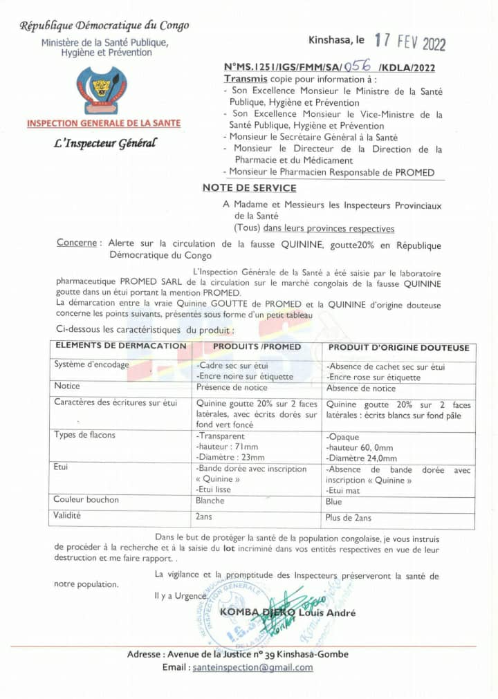L'inspection Générale de la santé alerte sur la sur la circulation des Fausses Quinine goutte 20% en RDC