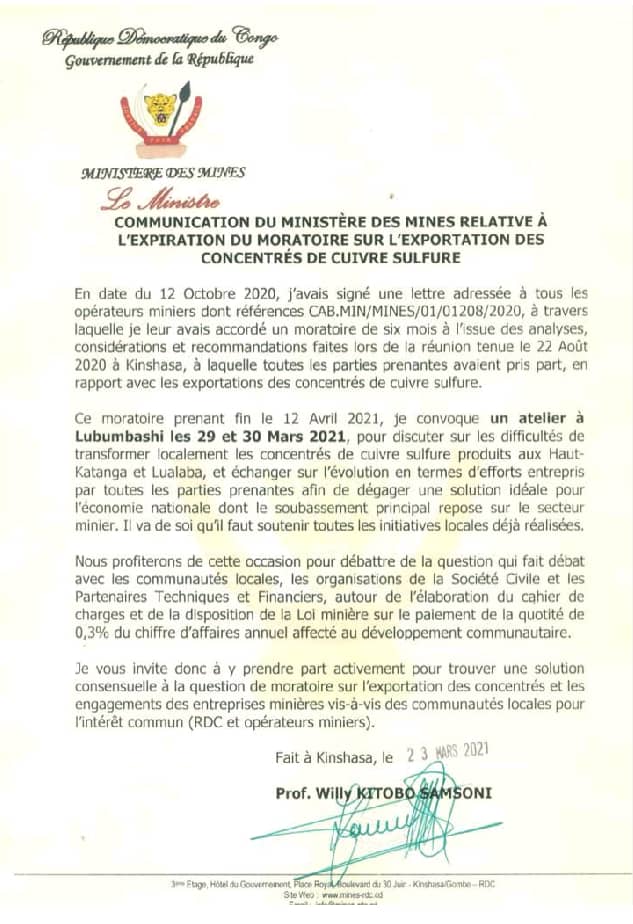 Communication du Ministère des Mines relative à l'expiration du moratoire sur l'expropriation des concentrés de cuivre sulfure du 23 mars 2021