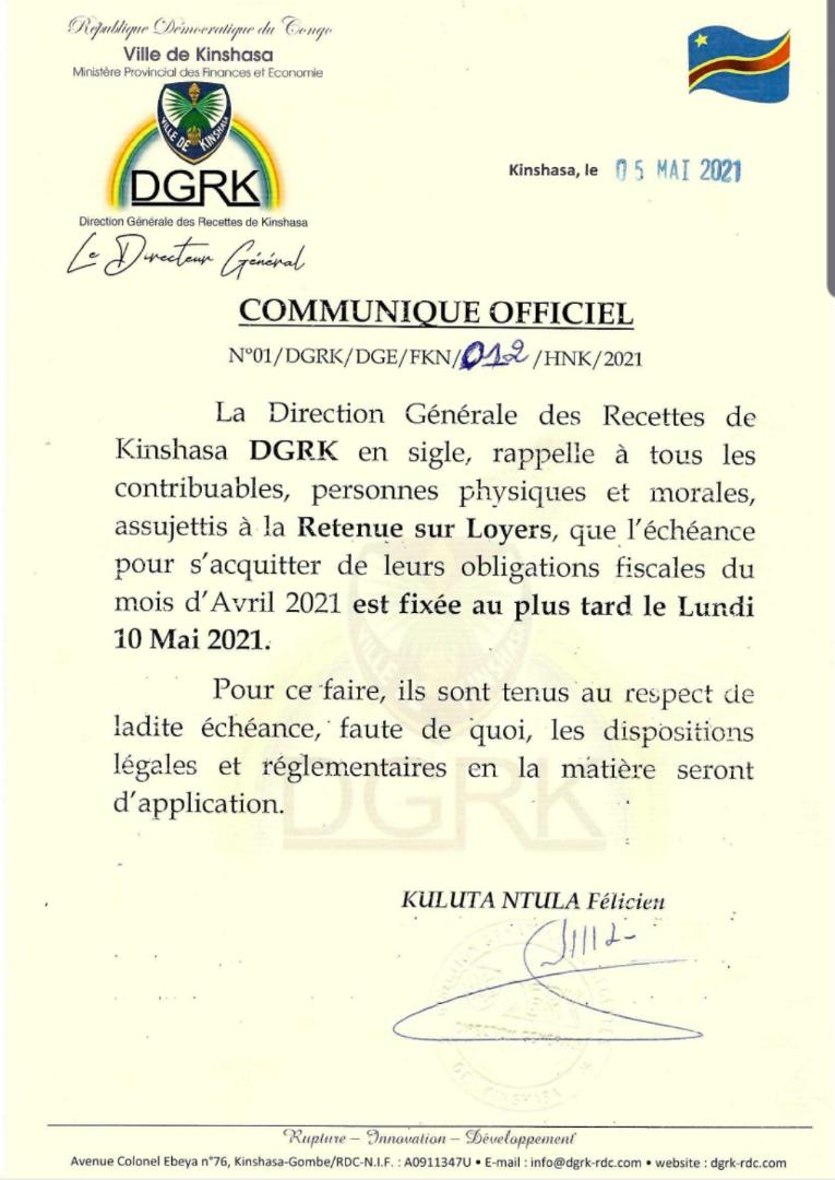 La DGRK informe à tous les contribuables, personnes physiques et morales que la date buttoir pour s’acquitter de leurs obligations fiscales du mois d’avril est prévue pour ce lundi 10 mai 2021. Le respect de l’échéance est de rigueur