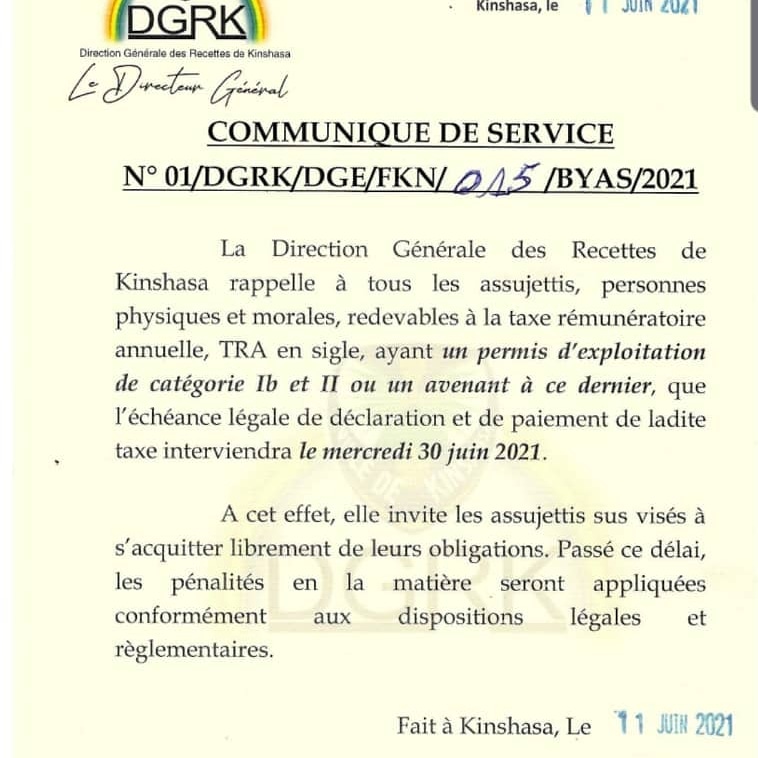 La DGRK rappelle à tous les assujettis personnes physiques et morales, redevables à la Taxe rémunératoire annuelle (TRA) que ce mercredi 30 Juin 2021 est la date fixée pour l’échéance. NB: Passé ce délai, les pénalités en la matière seront mises en vigueur.