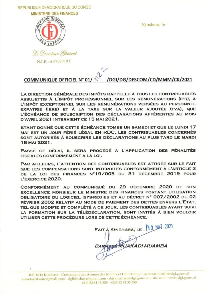 Le Directeur Général de la Direction Générale des Impôts informe les contribuables assujettis à l'Impôt Professionnel sur le Revenu (IPR) et à l'Impôt Exceptionnel sur les Rémunérations versées au Personnel Expatrié (IERE) et à la Taxe sur la Valeur Ajoutée (TVA) qu'ils sont autorisés à souscrire les déclarations afférentes au mois d'avril 2021 au plus tard le mardi 18 mai 2021.