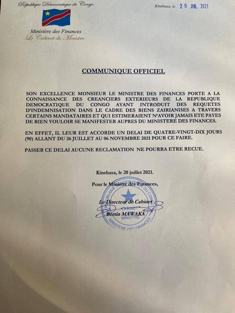 LE MINISTRE DES FINANCES INVITE LES CRÉANCIERS EXTÉRIEURS DE LA RDC AYANT INTRODUIT DES REQUÊTES DANS LE CADRE DE LA ZAÏRIANNISATION DE BIEN VOULOIR SE MANIFESTER. par la Loi organique n° 13/012 du 19 avril 2013 et la Loi organique n° 21/012 du 03 juillet 2021 (Textes coordonnés et mis à jour)