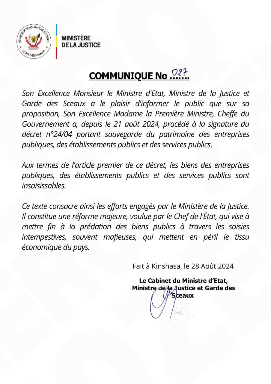 COMMUNIQUE N°027 DE SON EXCELLENCE MONSIEUR LE MINISTRE D’ETAT, MINISTRE DE LA JUSTICE ET GARDE DES SEAUX RELATIF A LA SIGNATURE DU DECRET N°24/04 PORTANT SAUVEGARDE DU PATRIMOINE DES ENTREPRISES PUBLIQUES, DES ETABLISSEMENTS PUBLICS ET DES SERVICES PUBLICS PAR SON EXCELLENCE MADAME LE PREMIER MINISTRE
