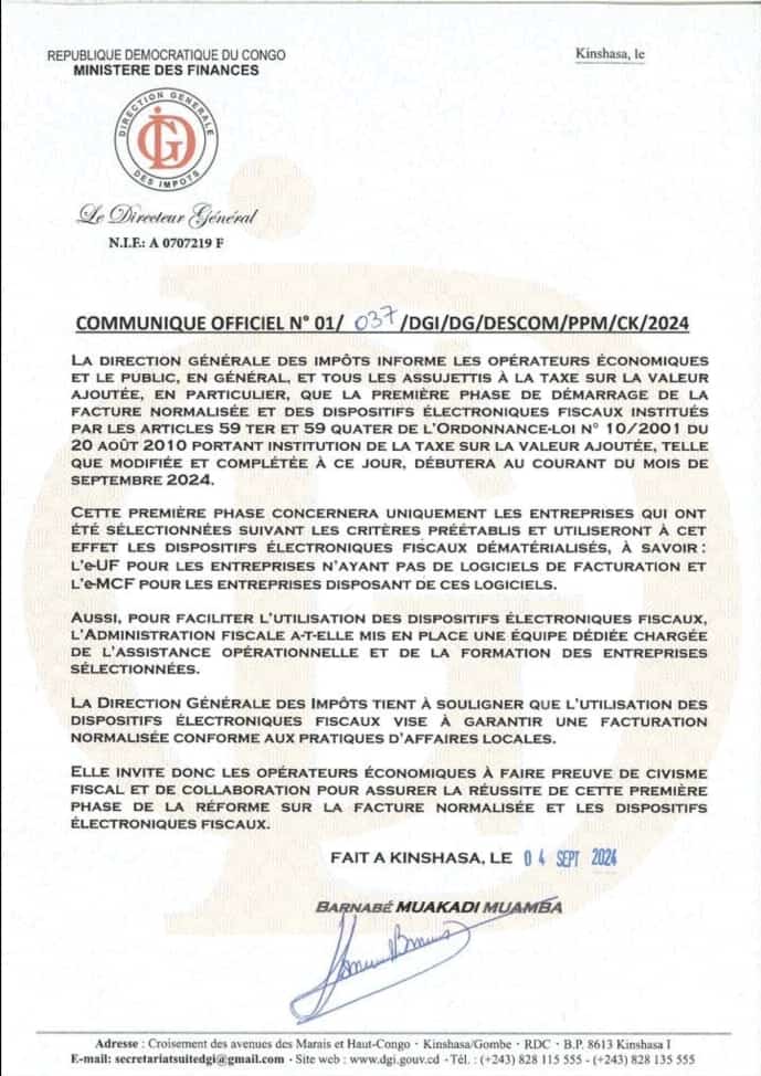 COMMUNIQUE OFFICIEL N°01/037/DGI/DG/DESCOM/PPM/CK/2024 RELATIVE À LA PREMIERE PHASE DE DEMARAGE DE LA FACTURE NORMALISEE ET DES DISPOSITIFS ELECTRONIQUES FISCAUX INSTITUES PAR LES ARTICLES 59 TER ET 59 QUATER DE L’ORDONNANCE-LOI N°10/2001 DU 20 AOUT 2010 PORTANT INSTITUTION DE LA TAXE SUR LA VALEUR AJOUTEE, TELLE QUE MODIFIÉE ET COMPLETEE
