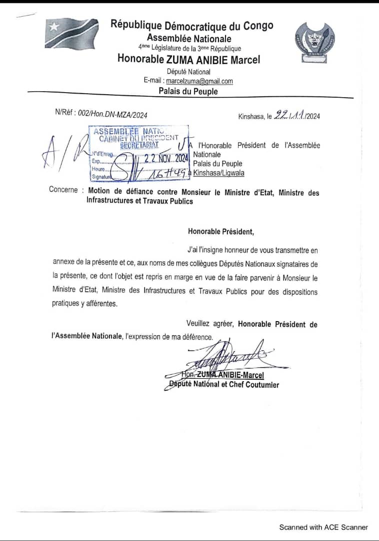 CONCERNE : MOTION DE DEFIANCE CONTRE MONSIEUR LE MINISTRE D’ETAT, MINISTRE DES INFRASTRUCTURES ET TRAVAUX PUBLICS