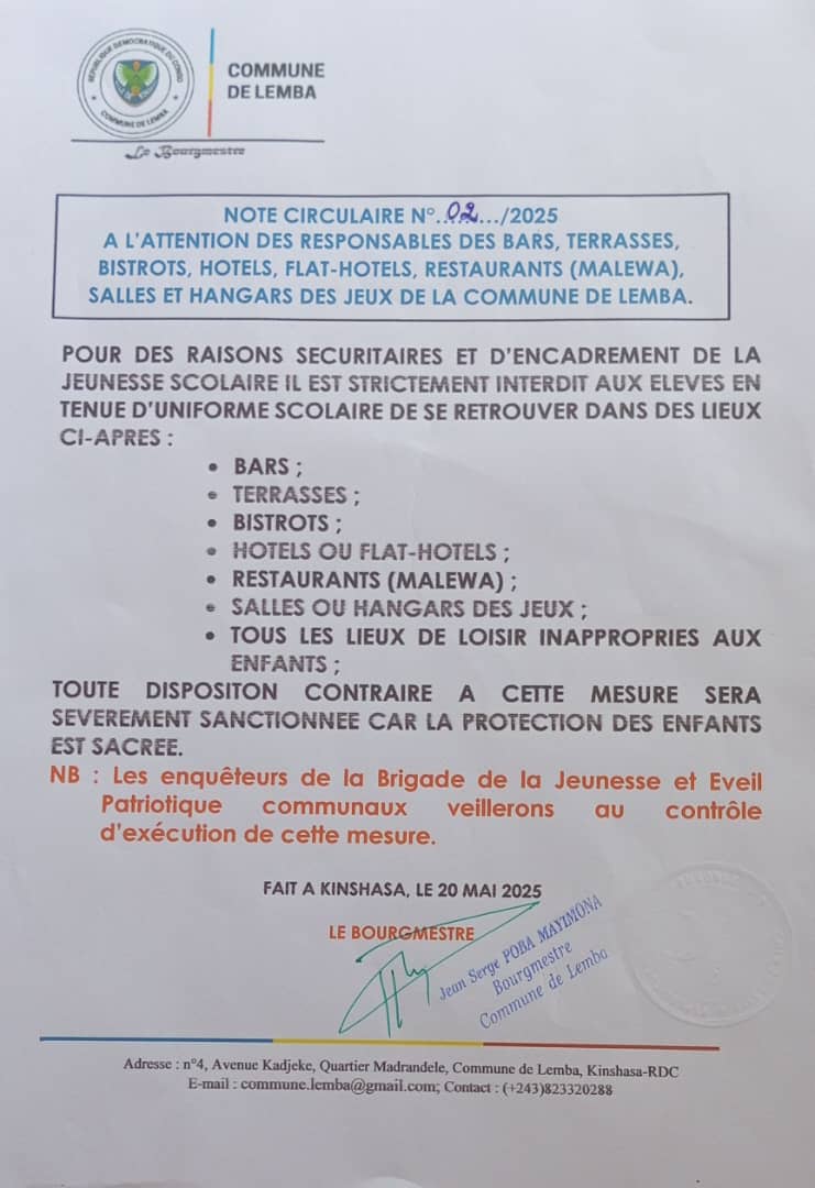 NOTE CIRCULAIRE N°02/2025 A L’ATTENTION DES RESPONSABLES DES BARS, TERRASSE, BISTROTS, HOTELS, FLAT-HOTELS, RESTAURANTS (MALEWA), SALLES ET HANGARS DES JEUX DE LA COMMUNE DE LEMBA