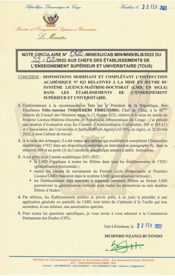 Note Circulaire N°002/MINESU/CAB.MIN/MNB/BLB/2022 du 22 février 2022 relative aux dispositions modifiant et complétant l'instruction académique n°023 relative à la mise en œuvre du système LMD dans les établissements de l'ESU en RDC.