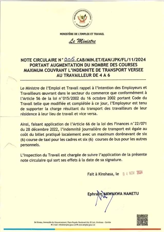NOTE CIRCULAIRE N°OO6 CAB/MIN.ET/EAN/JPK/FL/11/2024 PORTANT AUGMENTATION DU NOMBRES DES COURSES MAXIMUM COUVRANT L’INDEMNITE DE TRANSPORT VERSEE AU TRAVAILLEUR DE 4 A 6
