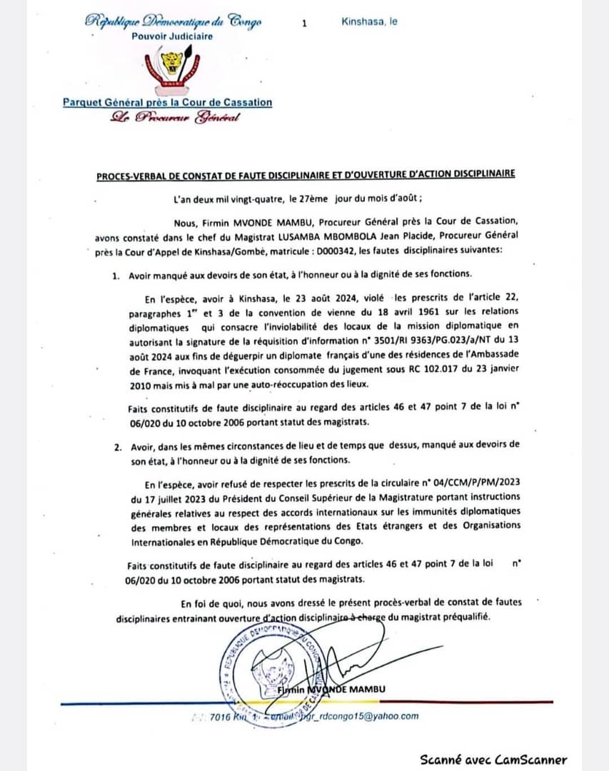 PROCES VERBAL DE CONSTANT DE FAUTE DISCIPLINAIRE A CHARGE DU MAGISTRAT LUSAMBA MBOMBOLA JEAN PLACIDE, PROCUREUR GENERAL PRES LA COUR D’APPEL DE KINSHASA/GOMBE, MATRICULE : D000342